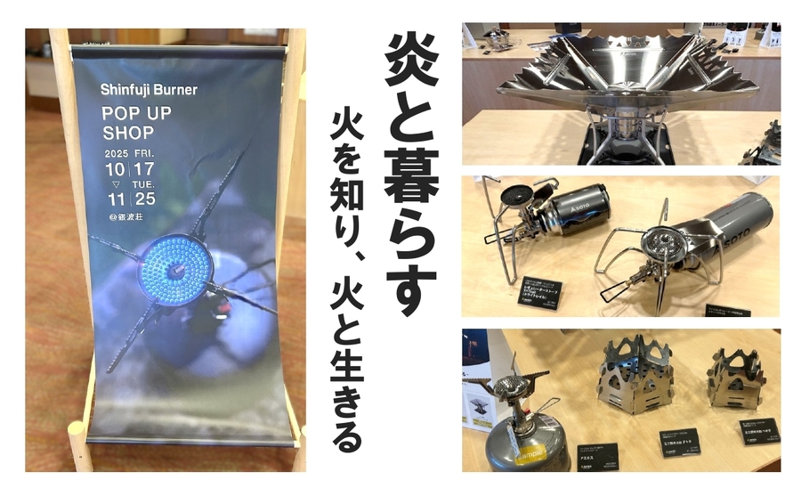 ポップアップショップ 「炎と暮らす -火を知り、火と生きるー」 開催日時 2025年10月17日(金)~11月25日(火) 開催時間 8:00~18:00 愛知県豊川市に本社を置く燃焼メーカーの新富士バーナーは、 工業・農業・アウトドア・厨房など幅広い分野で使用されるバーナー製品を開発・製造しています。 ストーブやランタン、焚き火台など、アウトドアだけでなく日々の暮らしにも寄り添う“火の道具”を手に取ってご覧いただけます! ぜひお気軽にお立ち寄りください。