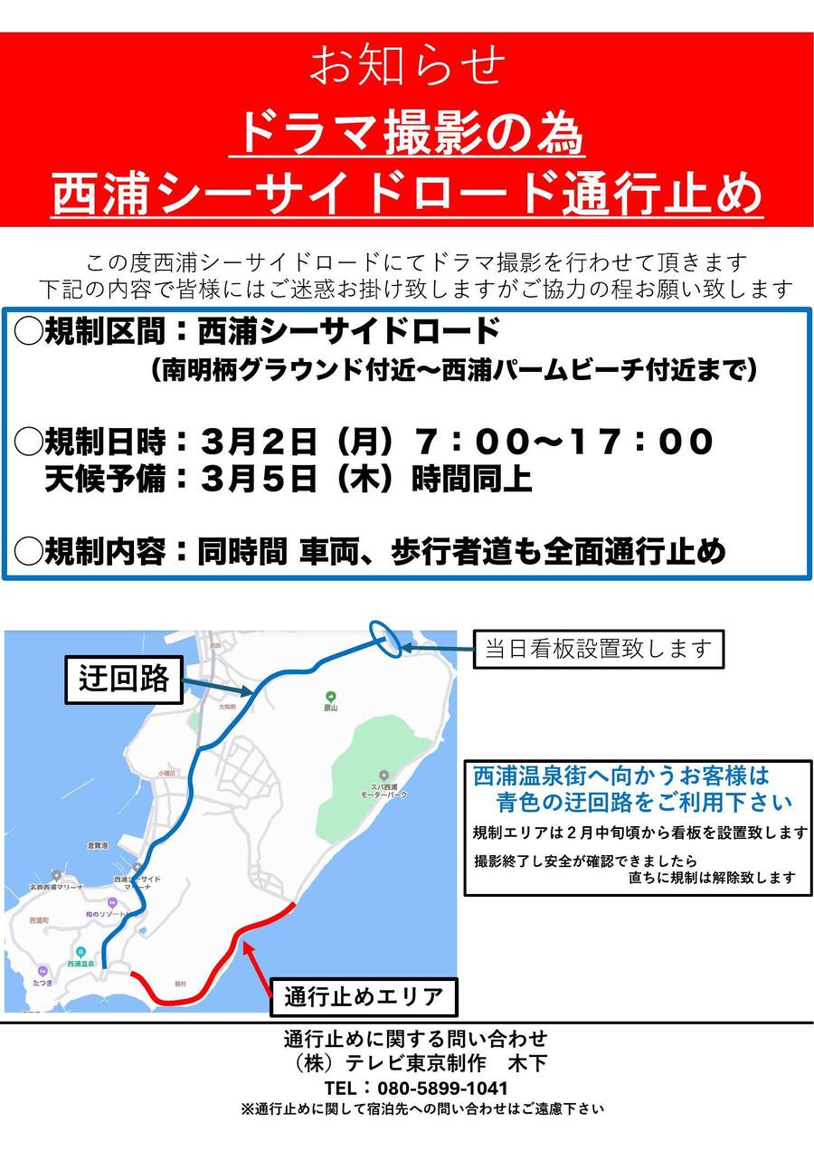3月2日(月)西浦シーサイドロードにて、ドラマ撮影の為、下記の時間通行止めになります。 3月2日(月)7:00~17:00 ※天候予備 3月5日(木)同時間 大変ご迷惑をおかけいたしますが、迂回ルートをご利用をお願いいたします。