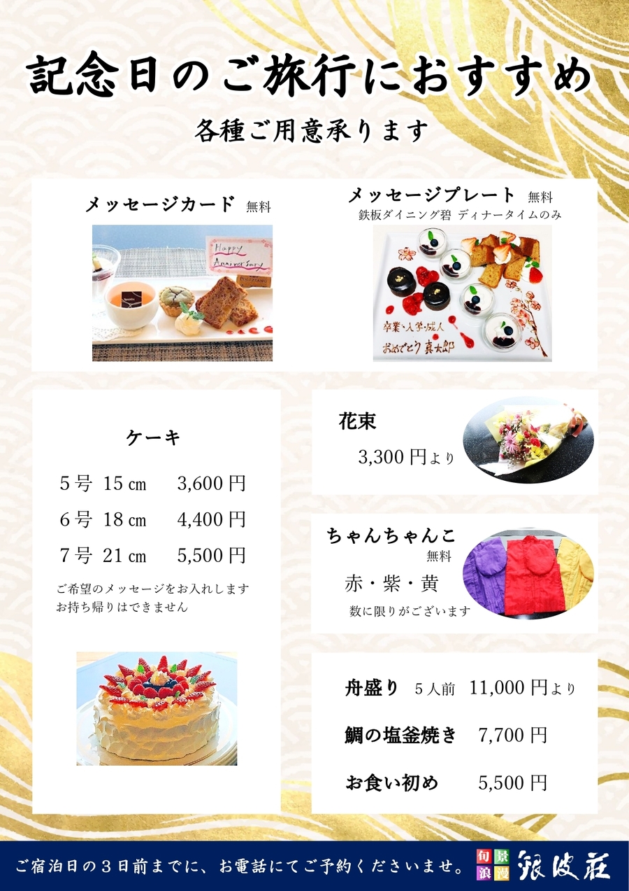 銀波荘では記念日を彩るお祝いオプションを多数ご用意しております。