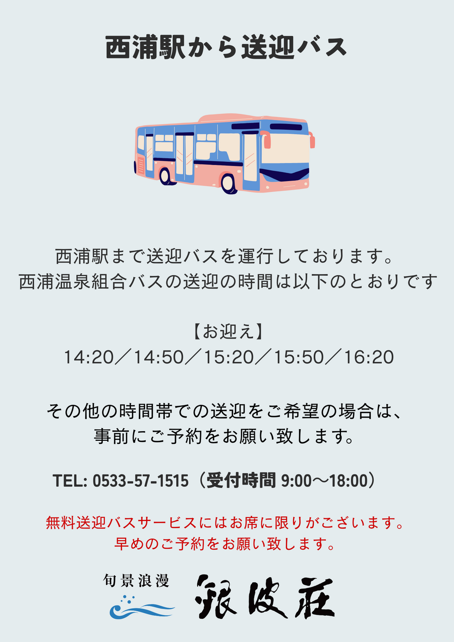 西浦駅まで送迎バスを運行しております。 西浦温泉組合バスの送迎の時間は以下のとおりです 【お迎え】 14:20/14:50/15:20/15:50/16:20 その他の時間帯での送迎をご希望の場合は、事前にご予約をお願い致します。 TEL: 0533-57-1515(受付時間 9:00~18:00) 送迎バスの時刻表はこちらでご確認ください。 https://gimpa.co.jp/faq/